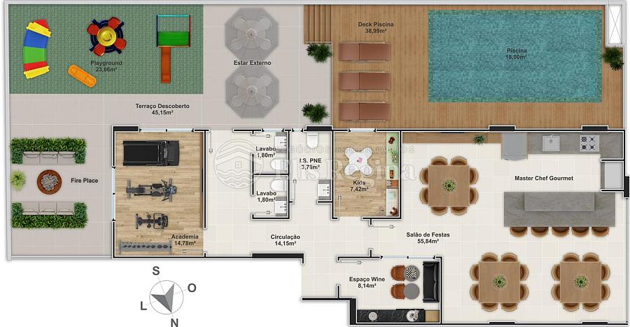 Salão de festas, Espaço gourmet, Wine Bar, Espaço Kids, Espaço Fitness, Lavabos, Piscina, Deck da Piscina, Banheiro PNE, Play-Ground, Lareira, Estar Externo